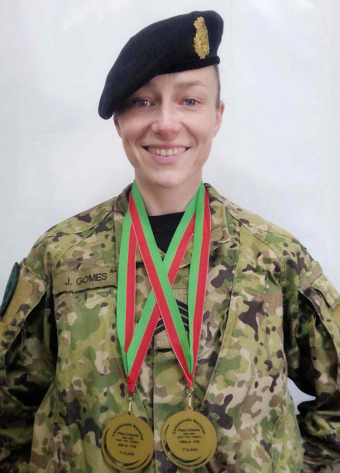 Joana Gomes, natural de Arcos de Valdevez e primeiro-sargento, conquistou duas medalhas de ouro nos 1500m e 800m femininos M35, no Campeonato Nacional Master de Atletismo de Pista Coberta 2024/25