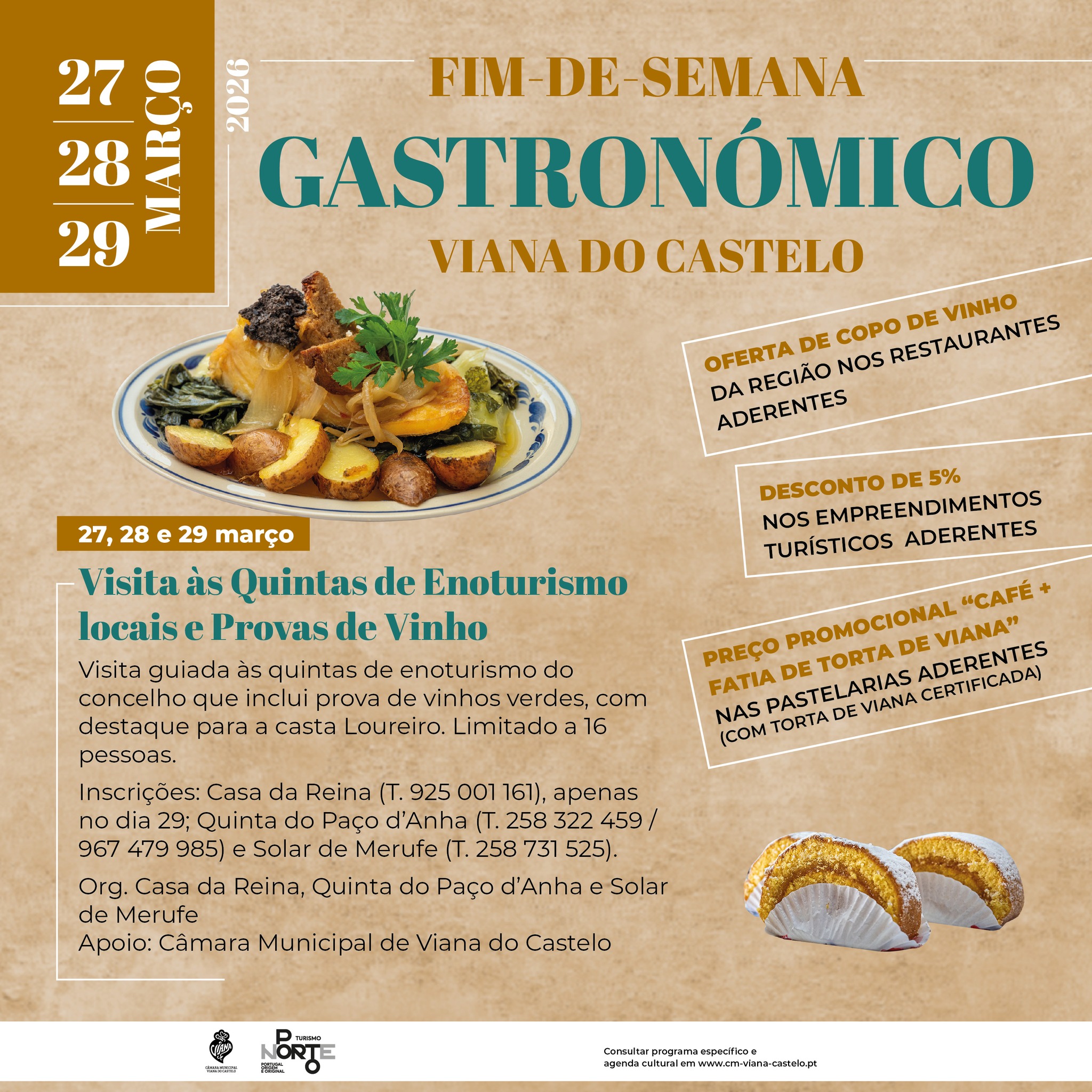 O Fim de semana Gastronómico de Viana do Castelo realiza-se de 27 a 29 de março, numa iniciativa organizada pela Câmara Municipal de Viana do Castelo e pela Entidade Regional de Turismo do Porto e Norte de Portugal que acontece também no arranque da programação de Páscoa.