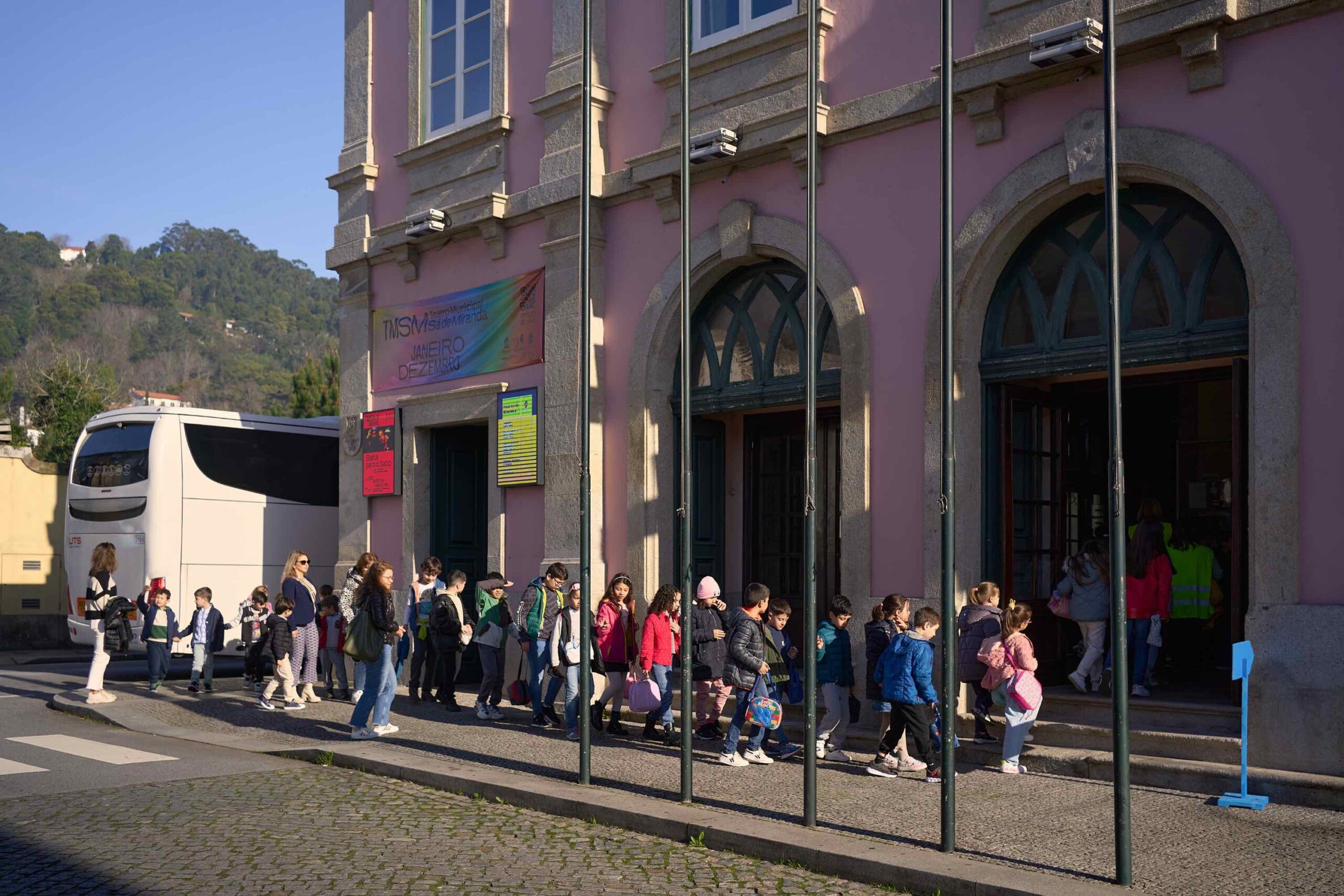 Começa assim o mês em que, diariamente, os autocarros com mais de 5.000 crianças provenientes de escolas de todo o concelho fazem fila à porta do Teatro Municipal Sá de Miranda, numa organização da companhia vianense e da Câmara Municipal de Viana do Castelo, que assegura o transporte e a gratuitidade dos bilhetes para os alunos das escolas públicas do concelho.