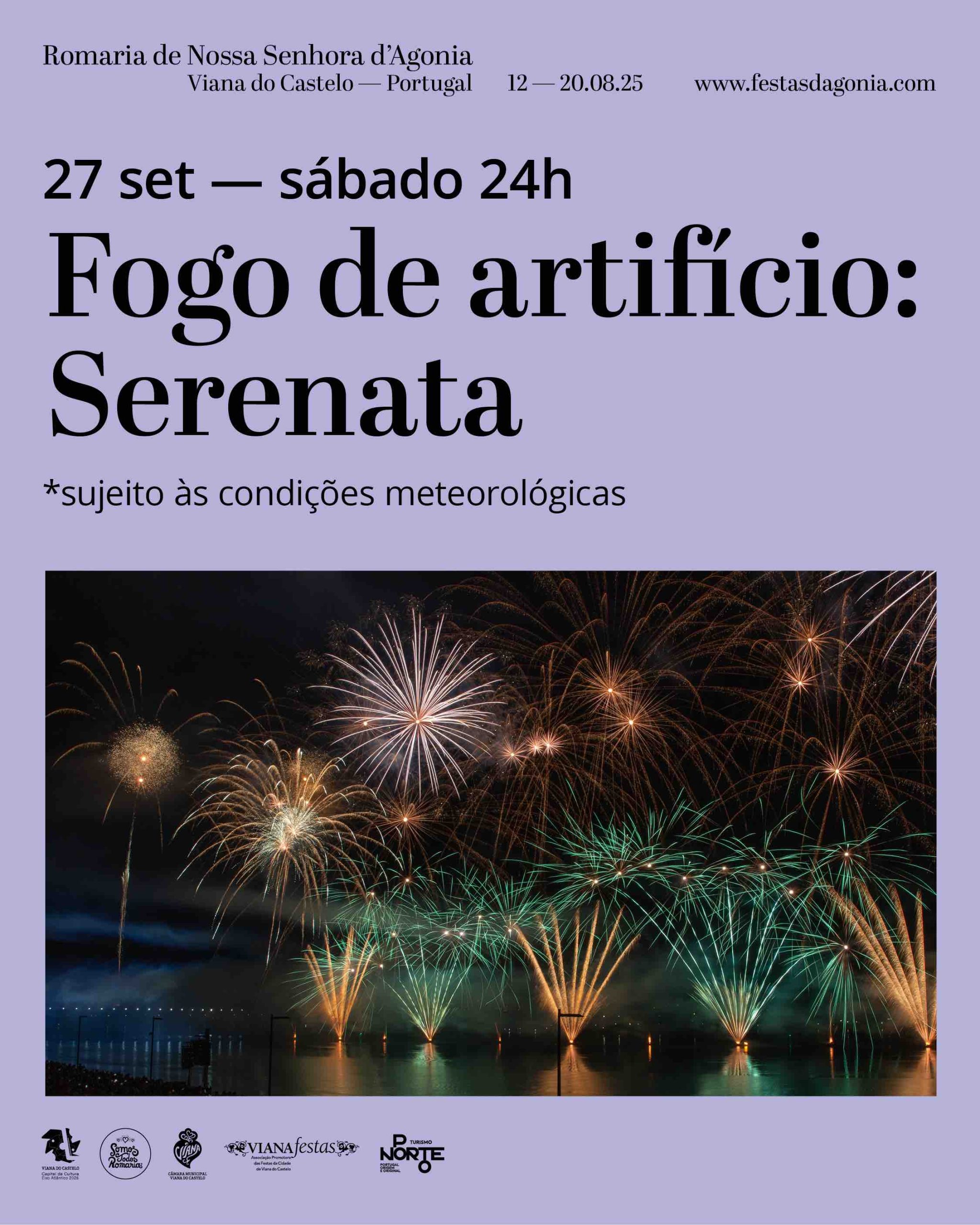 A Serenata da Romaria d’Agonia, espetáculo piromusical considerado um dos momentos mais emblemáticos das festas da cidade de Viana do Castelo, vai realizar-se no próximo dia 27 de setembro, às 00h, se as condições meteorológicas assim o permitirem.