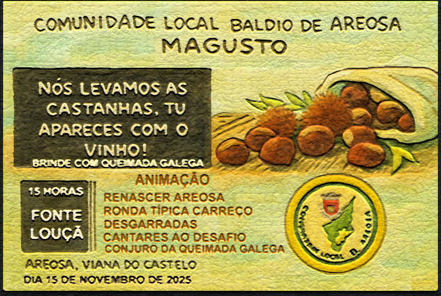 No dia 15 de novembro, às 15 horas, a Fonte Louçã, situada no monte da Areosa junto à central eólica de Carreço, vai ser palco do tradicional Magusto Comunitário promovido pela Comunidade Local do Baldio de Areosa. O evento, de entrada livre, promete uma tarde dedicada à celebração outonal, ao convívio popular e à valorização da cultura local, contando com oferta de castanhas assadas e uma programação recheada de animação para toda a família.