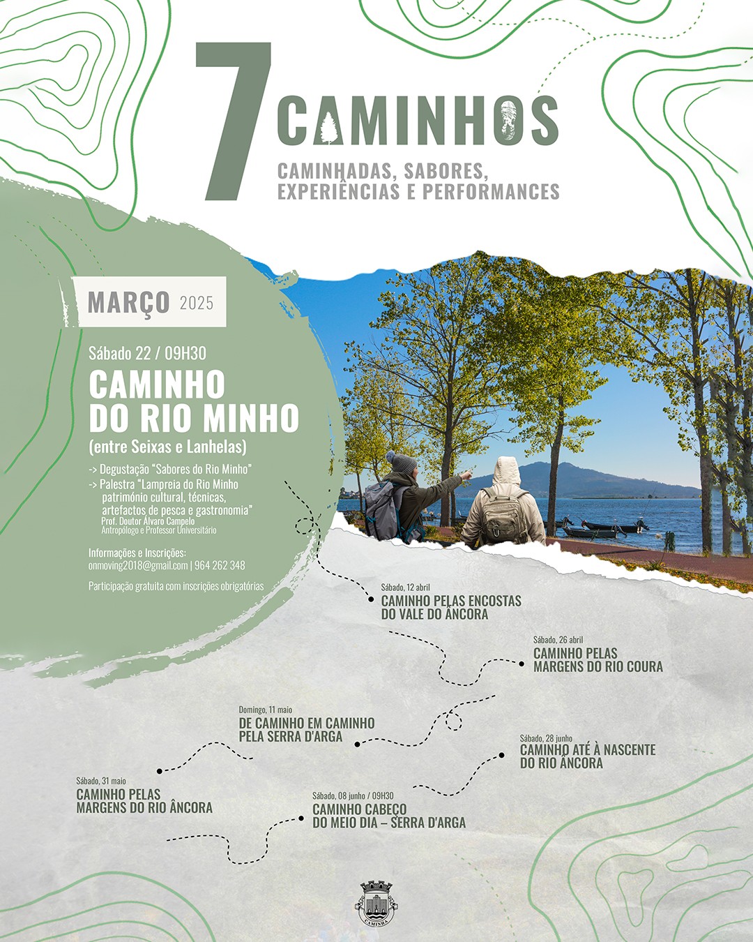 A primeira caminhada decorre sábado, dia 27 de março, às 9h30, e será op Caminho do rio Minho entre Seixas e Lanhelas. Haverá ainda degustação de sabores do rio Minho e ainda uma palestra sobre “Lampreia do rio Minho património cultural, técnicas, artefactos de pesca e gastronomia”.