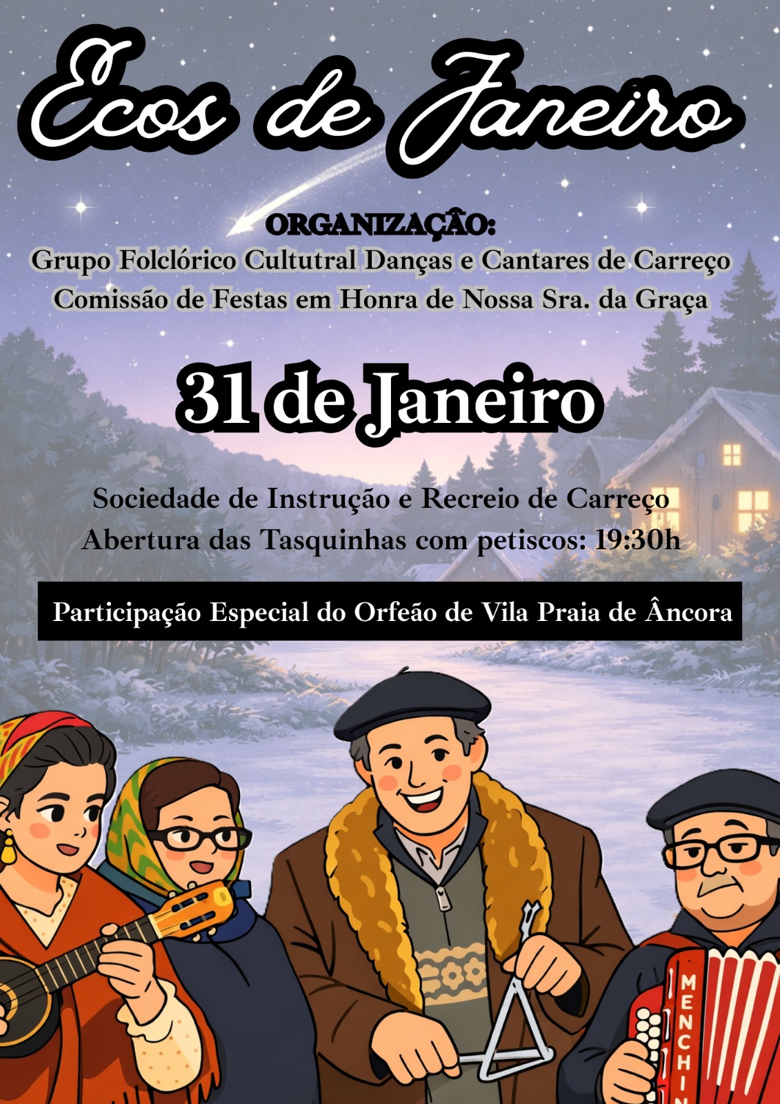 Depois de terem percorrido os quatro lugares da Freguesia, durante as noites deste janeiro invernoso, decorre no dia 31, às 19h30, o Ecos de Janeiro. Para encerramento desta tradição, o Grupo Folclórico Cultural Danças e Cantares de Carreço e a Comissão de Festas em Honra de Nossa Senhora da Graça organizam o Ecos de Janeiro, o que mais não é …