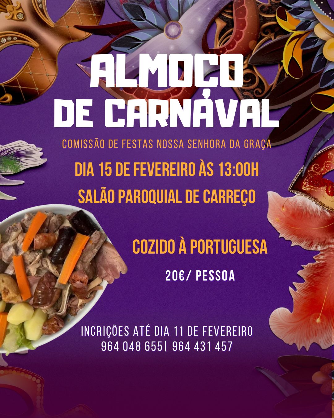 Em pleno Carnaval, para manter a tradição gastronómica que herdamos dos nossos antepassados, nada melhor que degustar um bom cozido à portuguesa neste entrudo, e simultaneamente colaborar com a Comissão de Festas na angariação de fundos.  Para tal, a Comissão de Festas em Honra de Nossa Senhora da Graça faz o convite a todos os amantes de um bom cozido …
