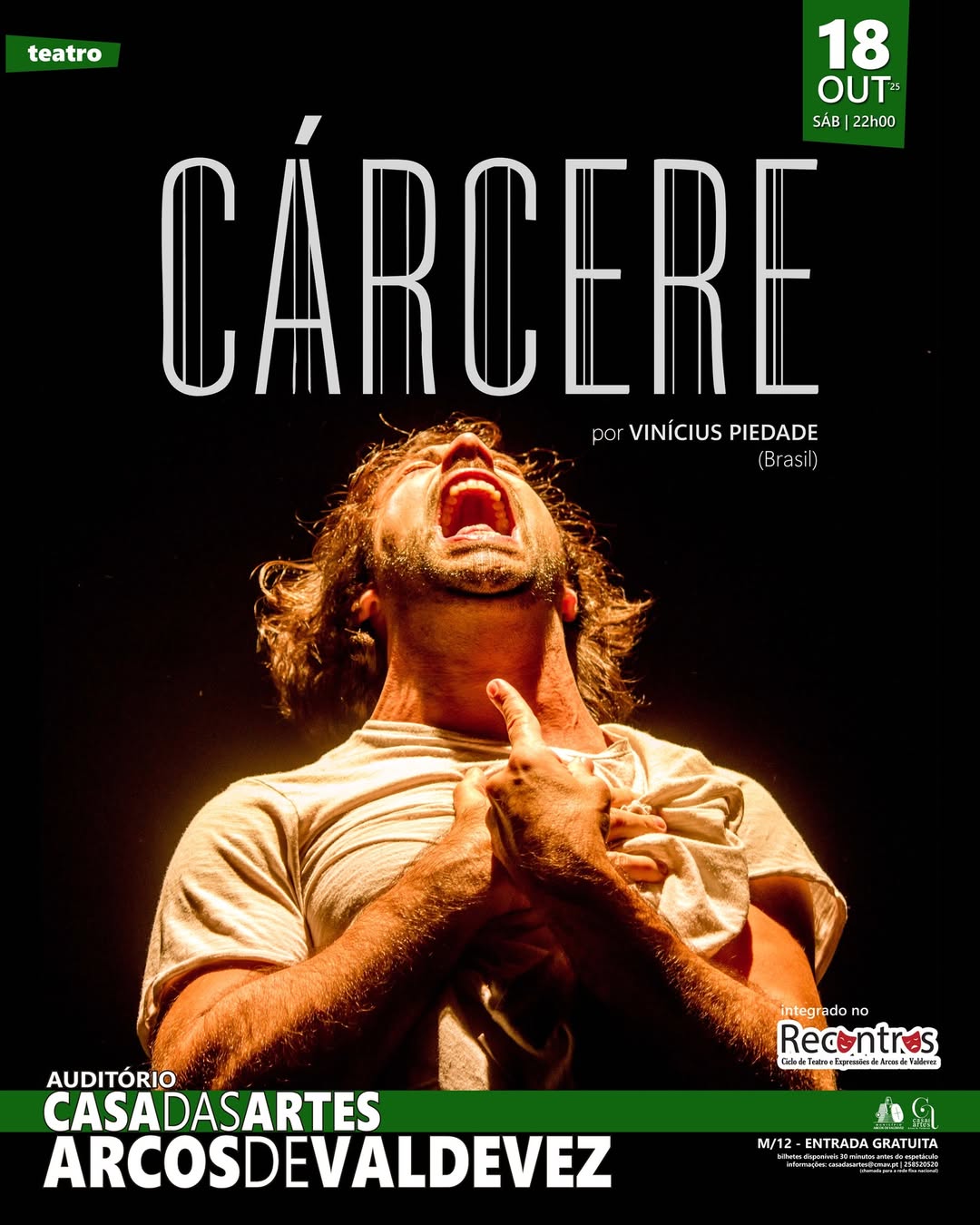 No âmbito do Recontros 2025- Ciclo de Teatro e Expressões de Arcos de Valdevez, Vinícius Piedade apresenta Cárcere – “uma semana na vida de um pianista que estando no cárcere (privado da liberdade do seu piano) será refém numa rebelião iminente. Ele vive em ritmo de contagem regressiva e suas expectativas, impressões, lembranças, reflexões e sensações são expressadas por ele num diário que inicia numa segunda-feira e termina quando estoura a rebelião, um domingo”, refere fonte da organização.