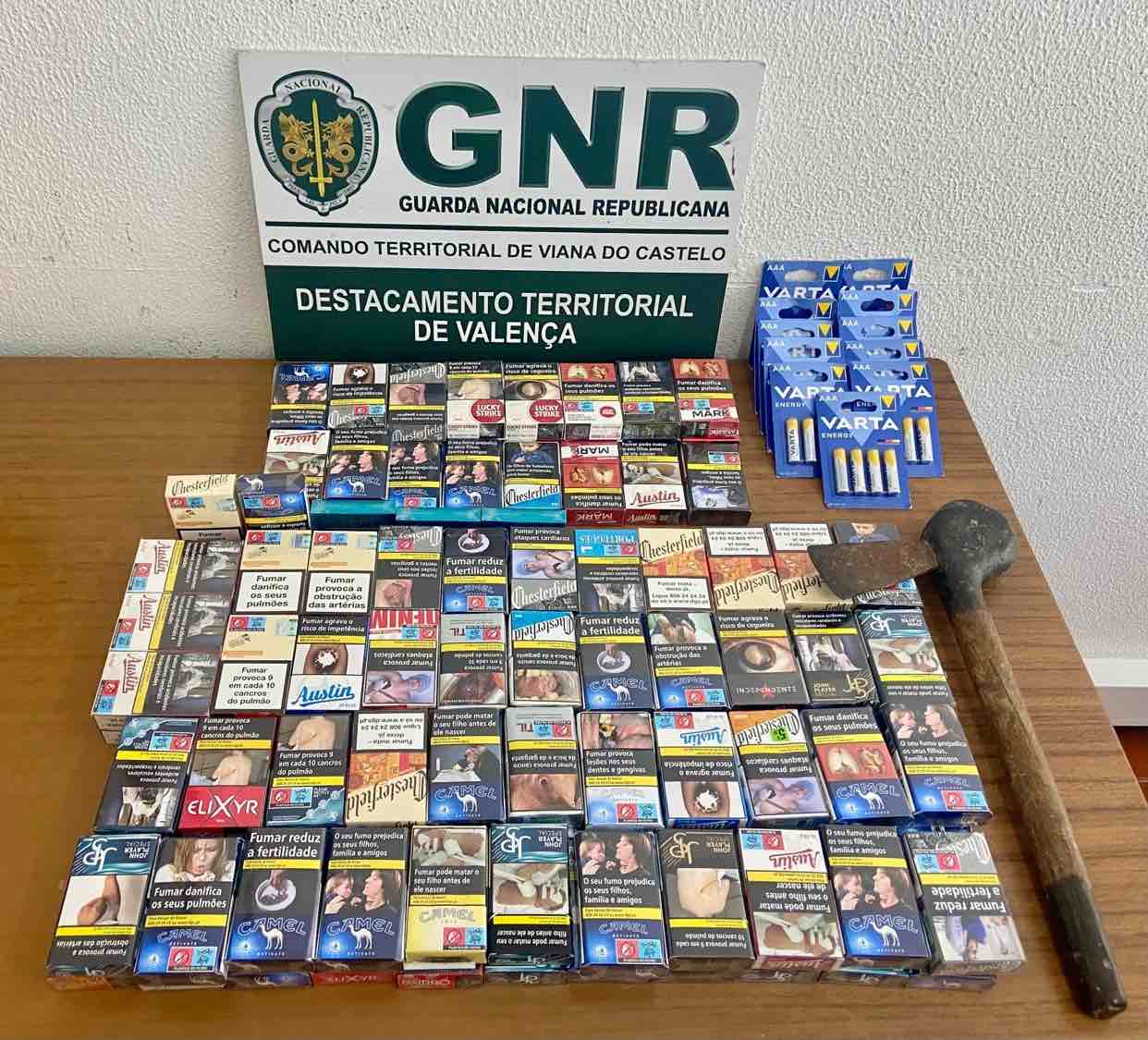No decorrer das diligências policiais foi dado cumprimento a quatro mandados de busca, dois em residência e dois em veículos, tendo resultado na apreensão do seguinte material:122 maços de tabaco de várias marcas; 44 pilhas e um machado.