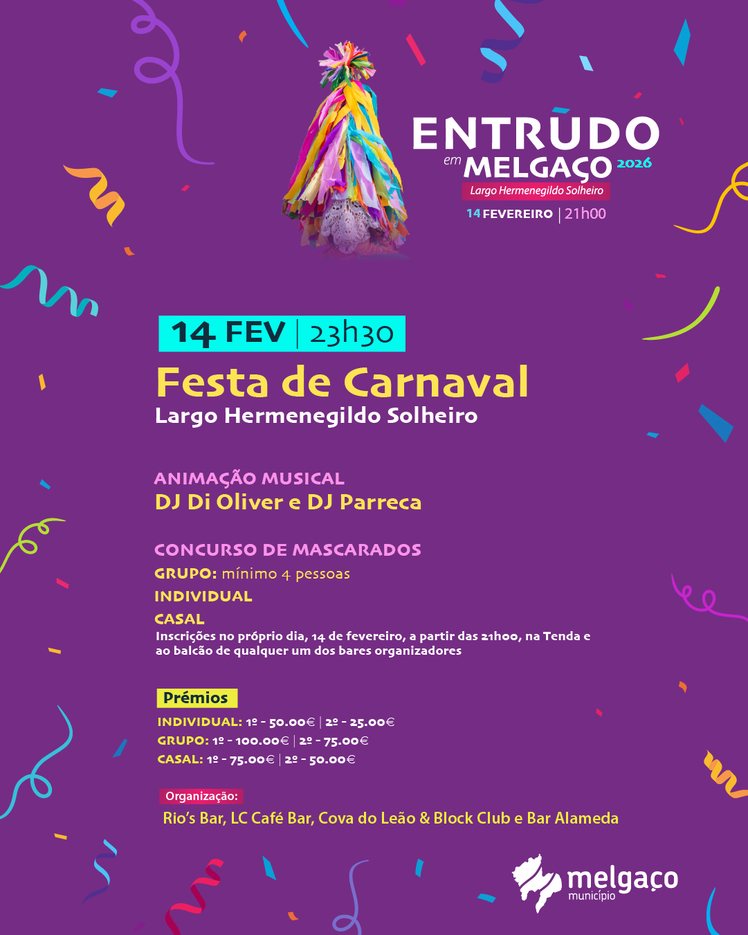 Depois do cortejo, acontece a Festa de Carnaval, com animação musical a cargo do DJ Di Oliver e do DJ Parreca, coorganizada com os bares locais participantes (Rio’s Bar, LC Café Bar, Cova do Leão & Block Club e Bar Alameda).