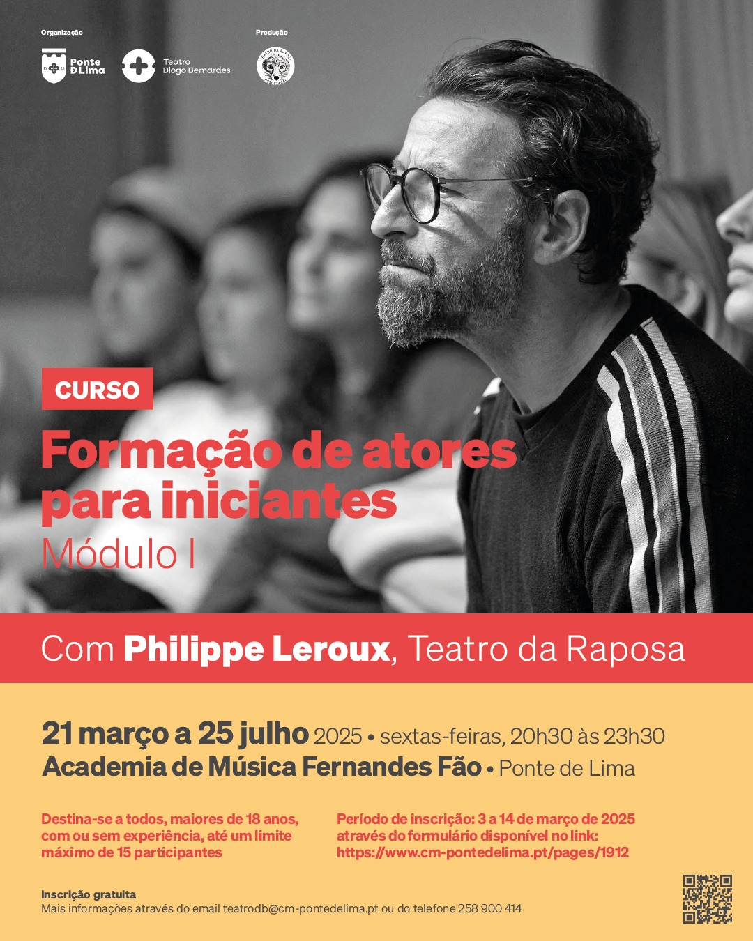 O Município Ponte de Lima vai promover o Curso – Formação de Atores para Iniciantes, Módulo I com Philippe Leroux, do Teatro da Raposa.
