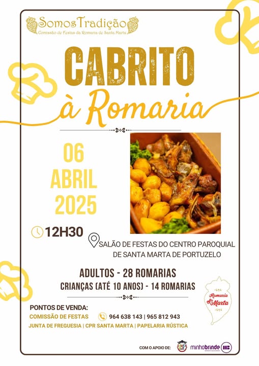 A Comissão de Festas da Romaria de Santa Marta de Portuzelo promove mais uma atividade, no próximo dia 6 de abril.  Será um convívio à mesa, agora para degustar o saboroso ‘‘Cabrito à Romaria’’ que, segundo o histórico, muito tem agradado aos apreciadores. Tanto quanto sabemos, quem participar, além de mais uma preciosa ajuda à tesoureira da comissão, a Carla …