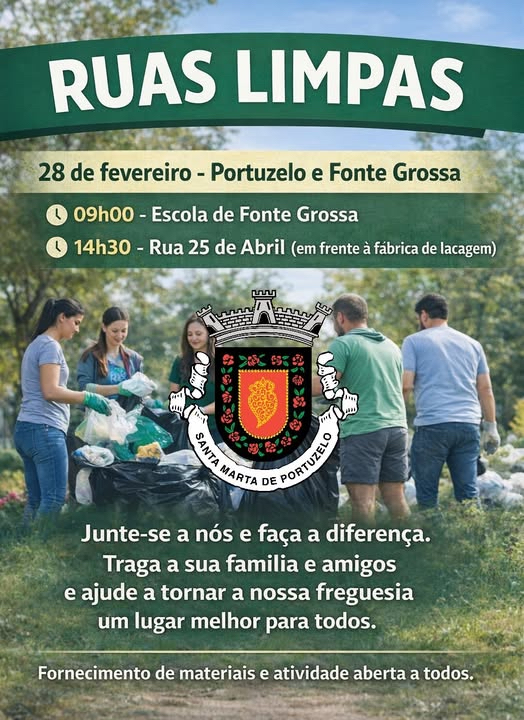 nicia no próximo sábado a iniciativa “Ruas Limpas”, com continuação nos dias 7, 14 e 21 de março. A Junta de Freguesia convida os santamartenses a participar e conta com o envolvimento dos cidadãos, sendo a participação de todos fundamental para garantir um ambiente mais limpo e agradável para a comunidade. Apela ainda à colaboração dos moradores na manutenção da frente das suas habitações, comprometendo-se a proceder à recolha dos resíduos resultantes dessas ações, bastando, para tal, a informação dos interessados.