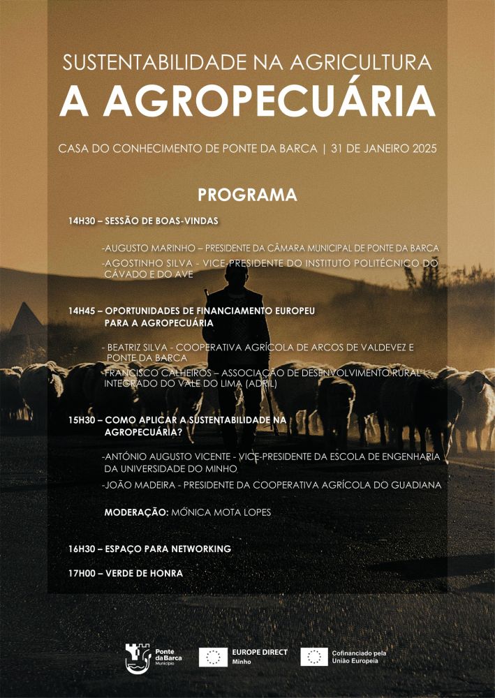 A Câmara Municipal de Ponte da Barca, em parceria com o Europe Direct Minho, organiza a conferência “Sustentabilidade na Agricultura”, no dia 31 de janeiro, às 14h30, na Casa do Conhecimento de Ponte da Barca. O evento visa promover práticas agrícolas sustentáveis e discutir as medidas da União Europeia para tornar o setor agrícola mais ecológico e resiliente, protegendo a biodiversidade.