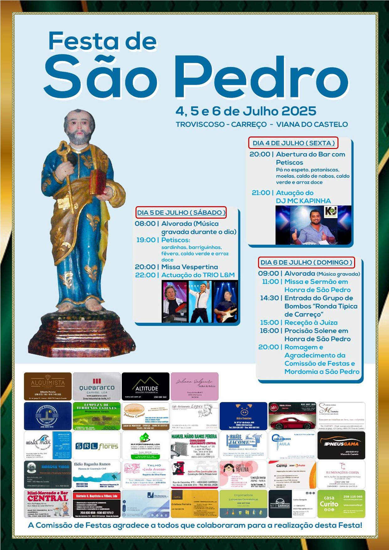 Troviscoso, um dos quatro lugares da Freguesia, realiza anualmente a festa de S. Pedro, na encosta da serra de Santa Luzia, donde se obtém uma vista maravilhosa sobre o oceano atlântico. Este ano, a Comissão de Festas organiza a festividade a partir de amanhã dia 04, e nos dias seguintes, 05 e 06, com o seguinte programa: No dia 04 …