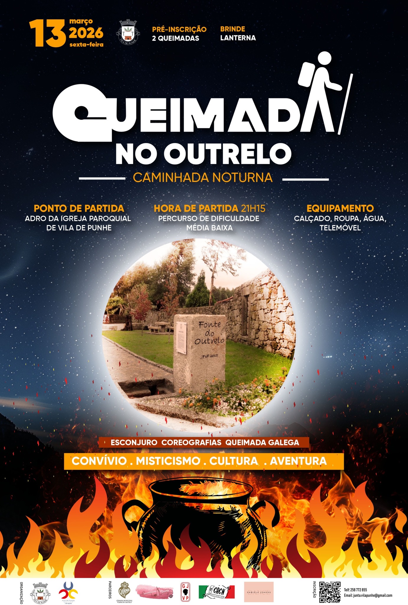 A caminhada termina em Outrelo, com a tradicional queimada galega e um momento de convívio e partilha.
