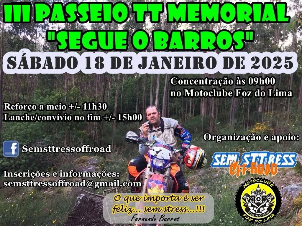 No passado sábado, 18 de janeiro, decorreu o III Passeio TT Memorial “Segue o Barros” organizado pelo grupo de motards “SEM STTRESS” com o apoio do Moto-Clube Foz do Lima. O evento motard TT iniciou cerca das 09h com a concentração dos participantes na sede social do Moto-Clube Foz do Lima, tendo culminado com um Lanche/convívio no fim do passeio …