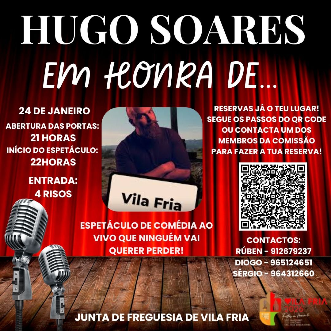 Este sábado, dia 24 de janeiro, o humorista Hugo Soares sobe ao palco da Junta de Freguesia de Vila Fria para uma noite de humor. A iniciativa é da Comissão de Festas, que disponibiliza os bilhetes para o espetáculo, que arranca às 22h. Esta é mais uma iniciativa de angariação de fundos para a festa em honra de São Martinho, …