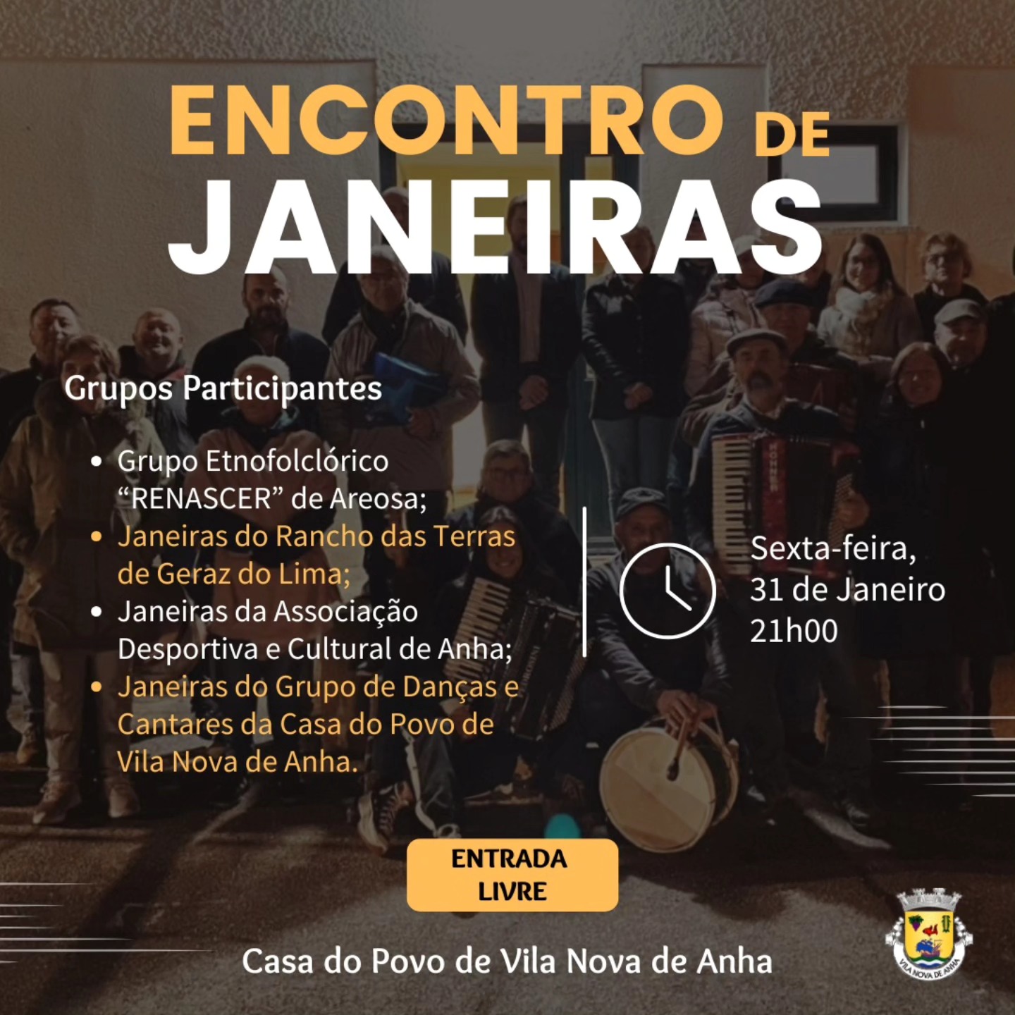 Na próxima sexta-feira, dia 31 de janeiro, às 21h, a Casa do Povo de Vila Nova de Anha abre as suas portas para o tradicional Encontro de Janeiras. Este ano, à Associação Desportiva e Cultural de Anha e ao Grupo de Danças e Cantares da Casa do Povo de Vila Nova de Anha juntam-se o Grupo Etnofolclórico “Renascer” de Areosa …