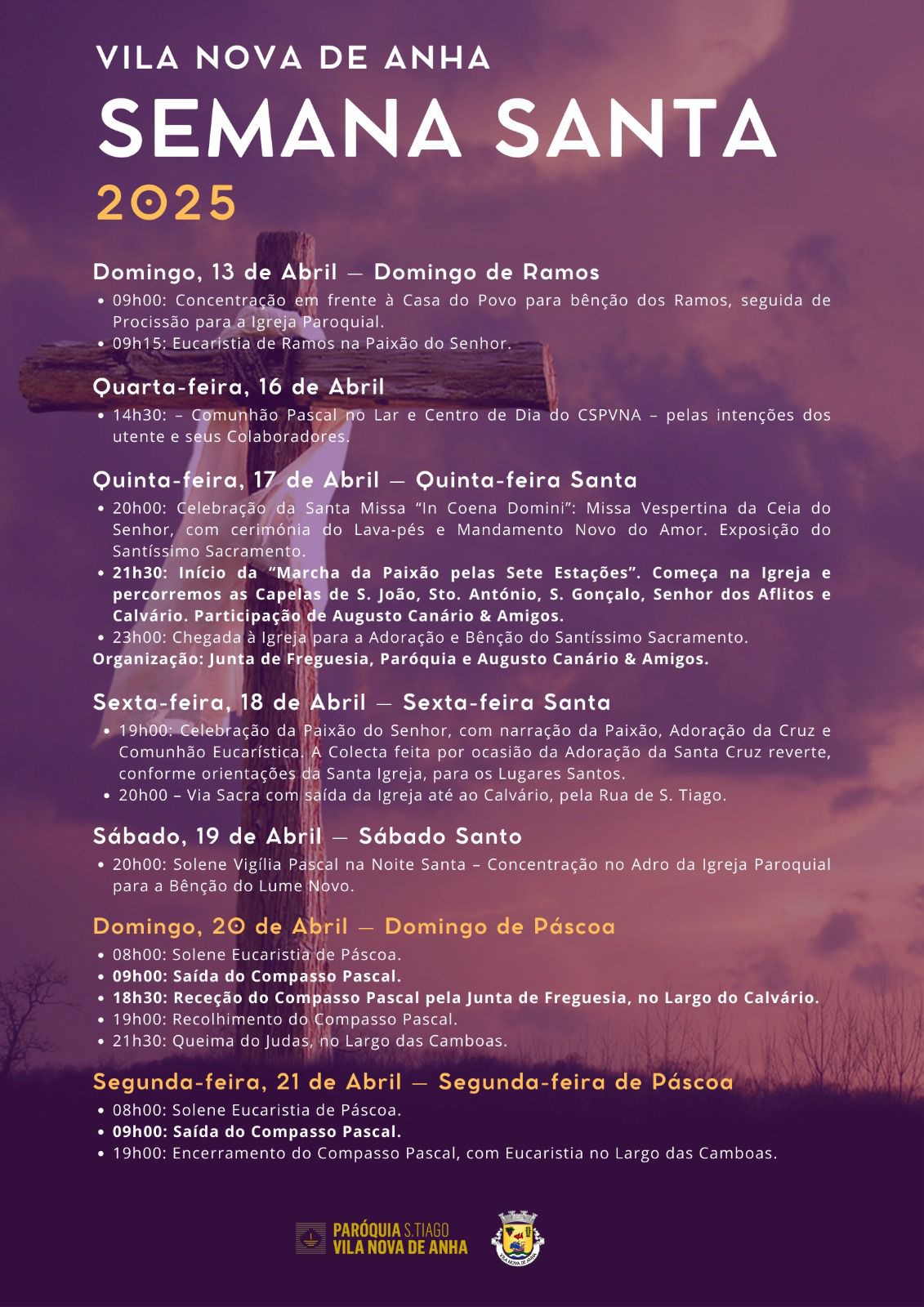 As celebrações pascais já se iniciaram no último domingo, com o Domingo de Ramos. Nesta quinta-feira, decorre a cerimónia do Lava-pés às 20h, e uma hora e meia depois inicia-se a Marcha da Paixão pelas sete Estações. A previsão de chegada à igreja é às 23h. Esta iniciativa é organizada pela Junta de Freguesia, paróquia e pelo Augusto Canário & …