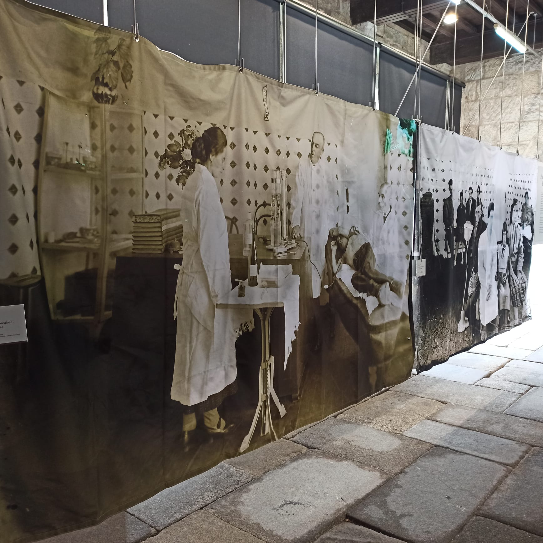 Uma perspectiva incomum do tema, focada ao nosso território, onde na simbólica utilização de panos de biombo ou cortinas de hospital ou lugares a saúde, como suportes expositivos numa convivência com materiais de enfermagem, de faianças de antanho e fotografia, constroem a narrativa de memória.