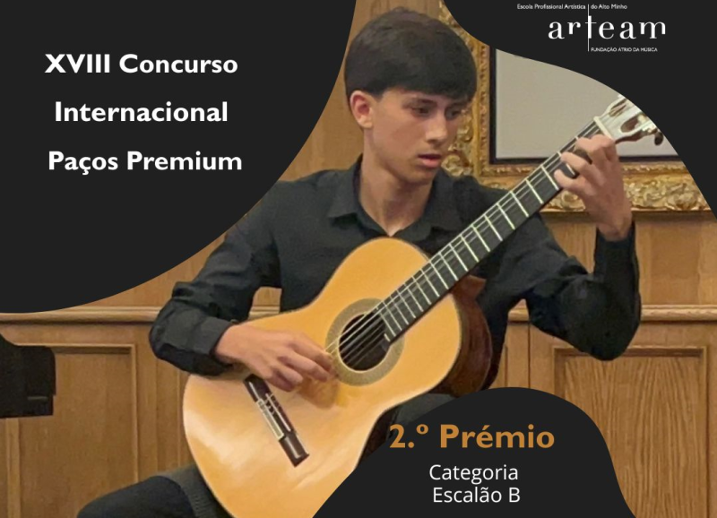O aluno do Professor João Passos venceu o 2.º Prémio no Escalão B, no XVIII Concurso Internacional Paços Premium, no passado fim de semana em Paços de Brandão. O guitarrista já venceu no passado mês o 1º prémio de Guitarra ‘Ilda Moura’, Categoria D – Cordas Dedilhadas, na cidade do Porto.