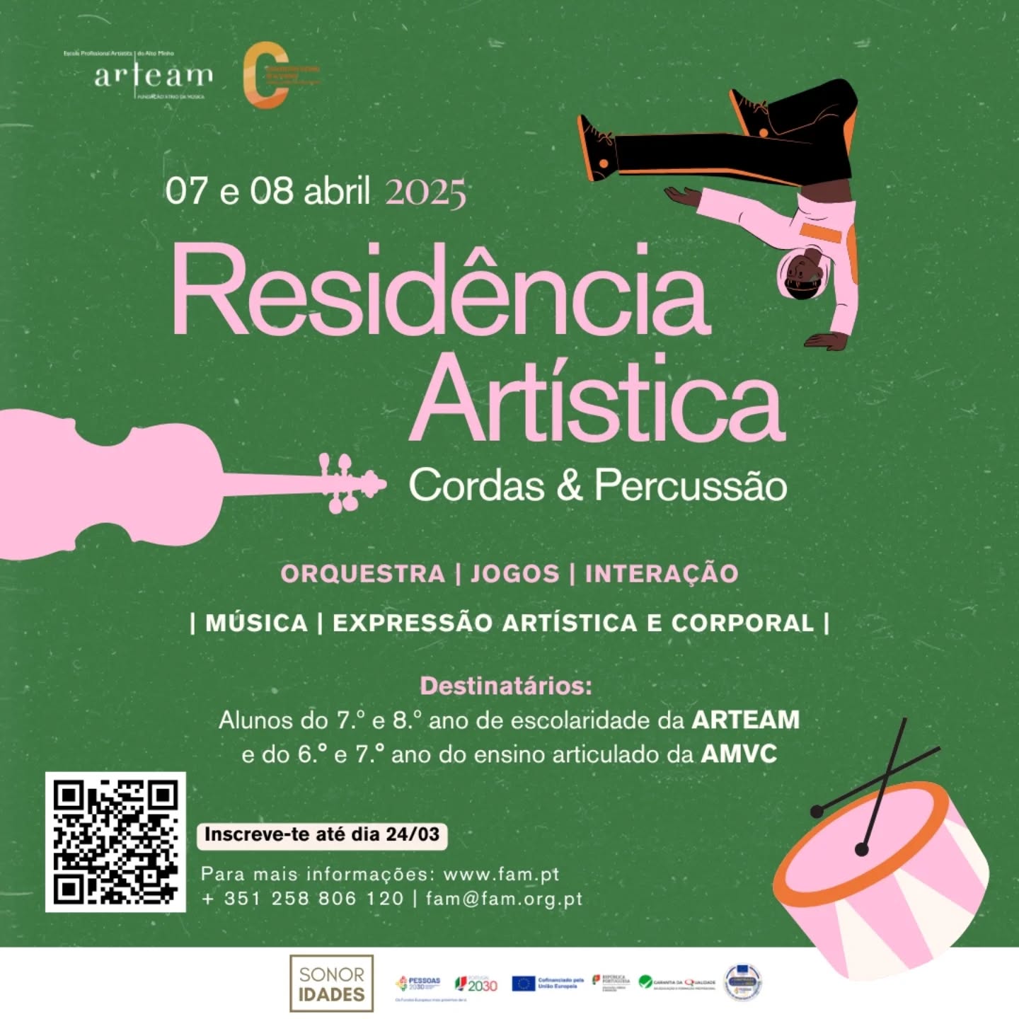 A ARTEAM e a AMVC vão promover uma Residência Artística de Cordas & Percussão, que se realizará nos dias 07 e 08 de abril. Esta atividade, uma experiência piloto integrada no Programa Sonoridades, destina-se aos alunos de cordas e percussão dos 7.º e 8.º anos de escolaridade da ARTEAM e dos 6.º e 7.º anos do ensino articulado da AMVC.