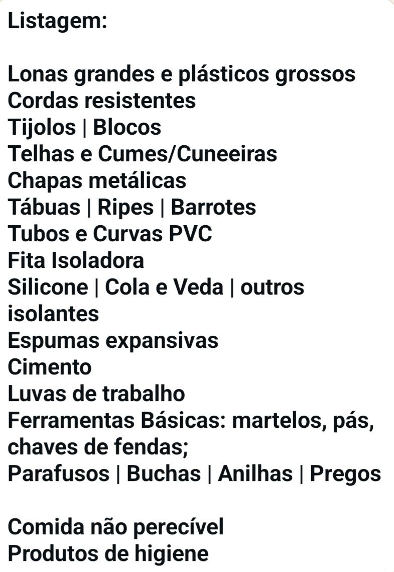 Com uma listagem de produtos, a Companhia apela à entrega no quartel dos materiais como Lonas, plásticos, cordas, telhas, chapas metálicas, silicone, cimento, ferramentas, entre outros materiais de construção.