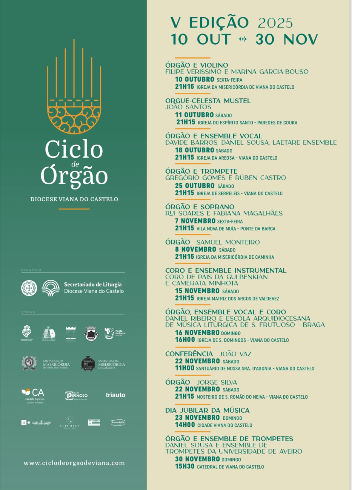A 22 de novembro, às 21h15, o Mosteiro de São Romão do Neiva recebe Jorge Silva. E o último concerto do ciclo acontece na Catedral de Viana no dia 30 de novembro, às 15h30, com concerto de Daniel Sousa e Ensemble de Trompetes da Universidade do Minho.
