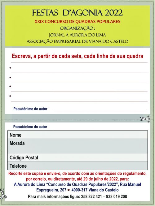 No domínio dos patrocínios, há, para já, 10 entidades a apoiar esta simpática iniciativa, com perspetivas de crescimento, daí que ainda não seja possível apresentar o quadro de patrocinadores, mas brevemente as entidades organizadoras, A Aurora do Lima e Associação Empresarial de Viana, o farão. Para espevitar a criatividade dos concorrentes, aqui fica a quadra vencedora do sexto prémio do 1º Concurso, no ano de 1987: Na Senhora da Agonia / Vi-te rezar e rezei / E então, p’ra sempre, Maria, / A ti bem preso fiquei. Quadra do Dr. José Crespo.