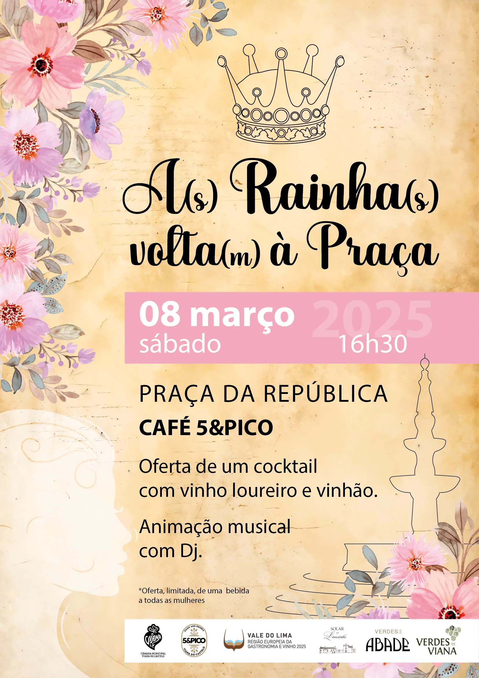 A 08 de março, Dia Internacional da Mulher, “A(s) Rainha(s) Volta(m) à Praça” é o mote para homenagear as mulheres vianenses e uma oportunidade de aprendizagem para todos os apaixonados pela história do concelho vianense. A Câmara Municipal de Viana do Castelo, o Café 5&Pico e os produtores de Vinho de Viana do Castelo unem-se numa iniciativa que pretende relembrar a Mulher, Rainha D. Maria II, e a sua importante relação com Viana do Castelo.