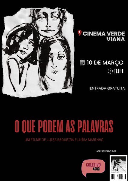 “O que podem as palavras” de Luísa Sequeira e Luísa Marinho vai ser exibido hoje, dia 10 de março, às 18h no cinema Verde Viana. A iniciativa é do Coletivo4900 em parceria com a Ao Norte.