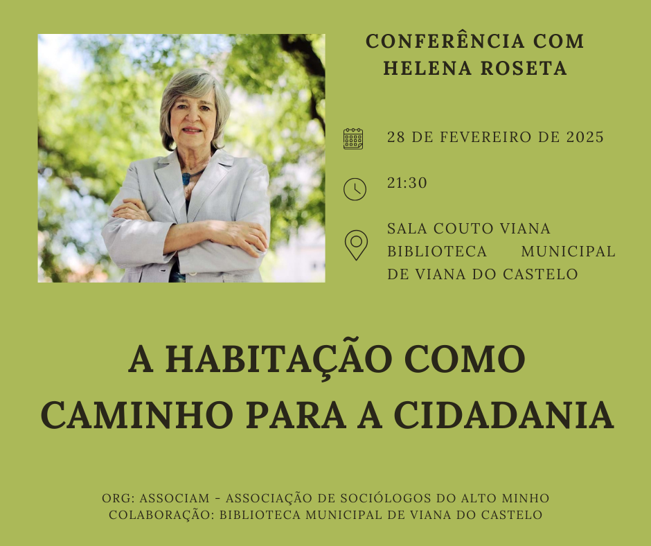 “A Habitação como caminho para a Cidadania” é o tema da conferência que Helena Roseta vai realizar hoje, dia 28, às 21h30, na Sala Couto Viana da Biblioteca Municipal de Viana do Castelo.