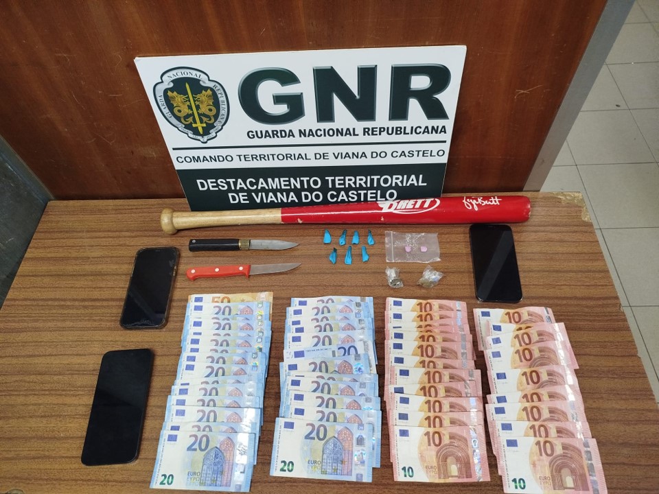 O comportamento suspeito e sinais de nervosismo levaram as autoridades a realizar uma revista pessoal e uma busca ao veículo, resultando na apreensão de várias substâncias ilícitas e objetos perigosos. Entre o material confiscado estavam: 18 doses de cocaína; 7,6 doses de MDMA; duas doses de haxixe; duas armas brancas e um taco de basebol; três telemóveis; 780 euros em numerário.
