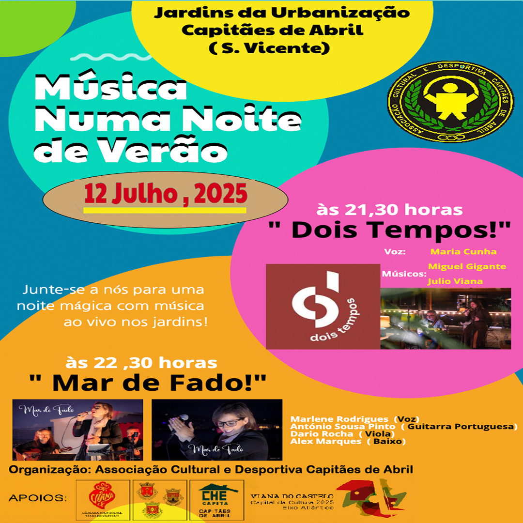 A Associação Cultural e Desportiva Capitães de Abril, com o apoio da Câmara Municipal de Viana do Castelo e integrada no programa da Cidade Europeia da Cultura do Eixo Atlântico 2025, promove duas grandes noites culturais nos Jardins da Urbanização Capitães de Abril (S. Vicente)que prometem animar o início de julho com arte, música e convívio ao ar livre.